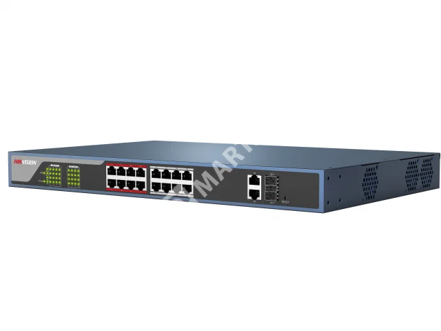 Hikvision DS-3E0318P-E (B) - Неуправляемый PoE-коммутатор укомплектован 16 FE-портами RJ-45 с поддержкой PoE, двумя комбинированными GE-портами с разъемами: RJ-45 — для подключения к сети по витой паре, SFP — по оптоволоконному кабелю. Общий бюджет РоЕ — 230 Вт, на порт –— 30 Вт. Предусмотрено приоритетное распределение РоЕ для портов 1 ~ 8. В режиме Extend PoE (для портов 9 ~ 16) дальность трансляции достигает 250 м.