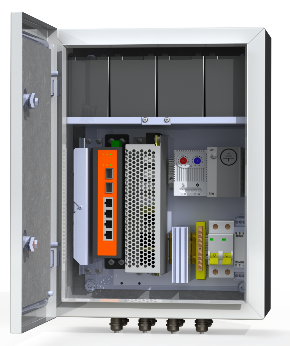 Двухполюсный защитный автомат 6А - 1 шт. Обогреватель 50Вт - 1 шт. Сдвоенный термостат - 1 шт. Блок бесперебойного питания 155Вт -1 шт. Аккумулятор 12В, 7А/ч - 4 шт. Промышленный неуправляемый коммутатор 4*PoE 802.3 af/at (бюджет 140 Вт), 2*SFP - 1 шт. Оптический кросс 4 порта SC/SM - 1 шт. Устройство грозозащиты линии 220В -1 шт.