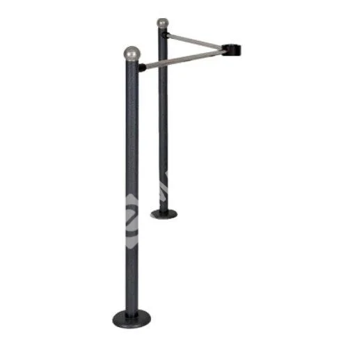 Комплект состоит из двух горизонтальных перемычек, двух стационарных хромированных стоек, которые соединены через разрезное кольцо с турникетом.