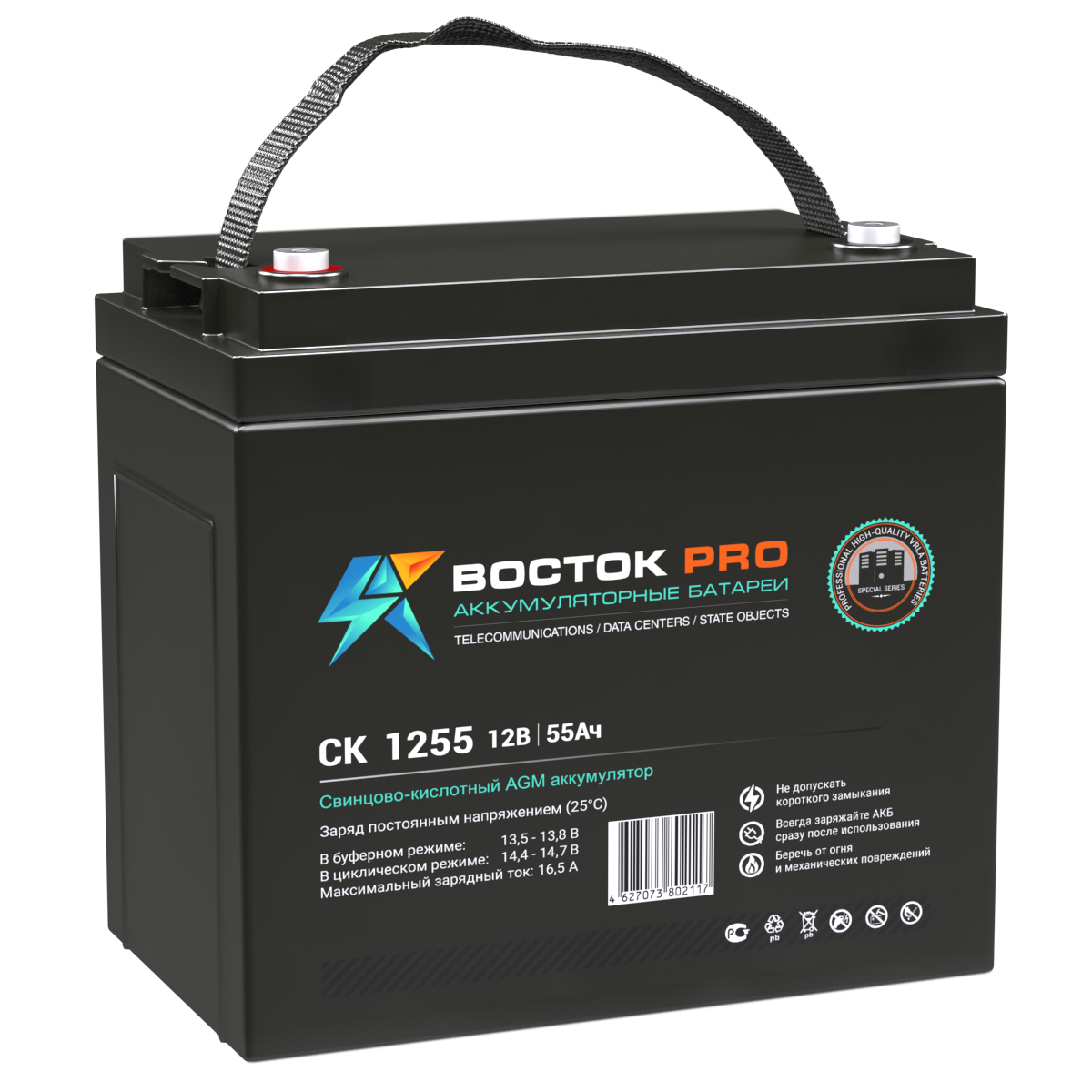 Свинцово-кислотные аккумуляторы ВОСТОК серии CK предназначены для использования в системах бесперебойного питания, резервного энергоснабжения, автономных энергосистемах. Изготовлены по AGM технологии (электролит, абсорбированный в стекловолоконном сепараторе), являются герметизированными и необслуживаемыми, со сроком службы в буферном режиме 10 лет (от 5 до 26 Ач – 5 лет). Обладают высокими разрядными и эксплуатационными характеристиками благодаря использованию в составе электролита и намазной пасты специальных добавок, препятствующих коррозии и замедляющих процесс старения.