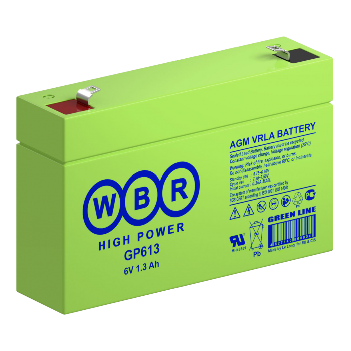 Аккумулятор WBR GP613 - герметизированная, выполненная по технологии AGM, аккумуляторная батарея общего применения со сроком службы до 8 лет в буферном режиме или 260 циклов заряда-разряда в циклическом режиме при 100% разряде. Высокоэффективная перезаряжаемая батарея, не требующая обслуживания в течение всего срока службы.