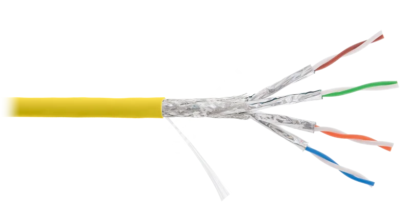 Кабель NIKOLAN S/FTP 4 пары, Кат.7а (Класс Fа), тест по ISO/IEC, 1000МГц, одножильный, BC (чистая медь), 23AWG (0,58мм), внутренний, LSZH нг(А)-HFLTx, желтый, 500м - гарантия: 5 лет / 15 лет системная