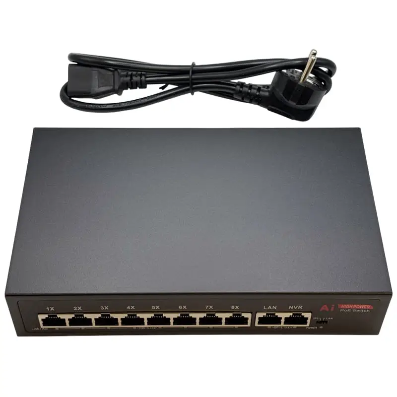 - 2 гигабитных Uplink-порта: Два порта 10/100/1000 Мбит/с предназначены для подключения видеорегистратора (NVR) и сети интернет-провайдера, обеспечивая высокоскоростную передачу данных без узких мест.